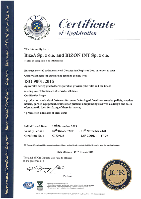 În 2002, Grupul BizeA – BIZON a implementat și certificat un sistem comun de asigurare a calității în conformitate cu PN-EN ISO 9001:2015.